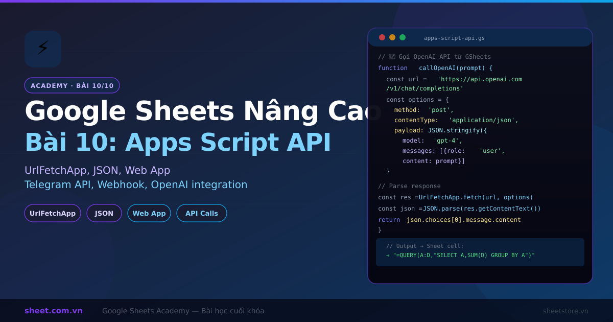Bài học cuối trong series Google Sheets Nâng Cao: Apps Script nâng cao với UrlFetchApp gọi external API, xử lý JSON, tạo web app, tích hợp Telegram và webhook receiver.