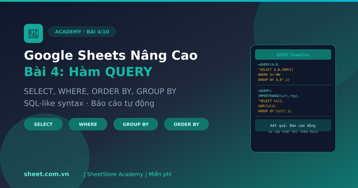 Hướng dẫn hàm QUERY Google Sheets từ cơ bản đến nâng cao. SELECT, WHERE với AND/OR, ORDER BY, GROUP BY, HAVING, LABEL, kết hợp IMPORTRANGE, xây dựng báo cáo bán hàng tự động.