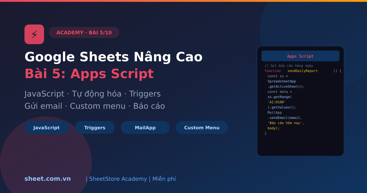 Hướng dẫn toàn diện Apps Script Google Sheets cho người mới: viết function đầu tiên, đọc/ghi dữ liệu, tạo custom menu, cài triggers, gửi email tự động, và ví dụ thực tế về báo cáo hàng ngày.
