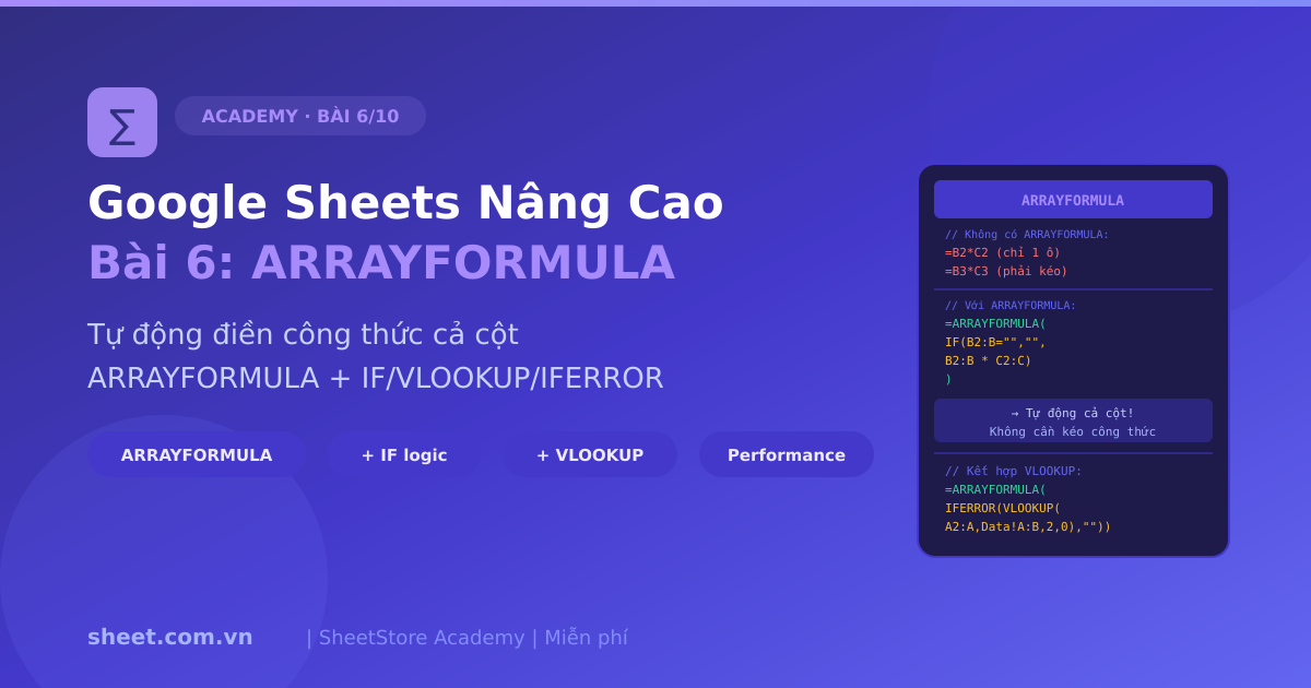 Hướng dẫn ARRAYFORMULA Google Sheets từ cơ bản đến nâng cao. Tự động điền công thức cả cột, kết hợp IF/VLOOKUP/IFERROR, tối ưu performance và tránh lỗi thường gặp.