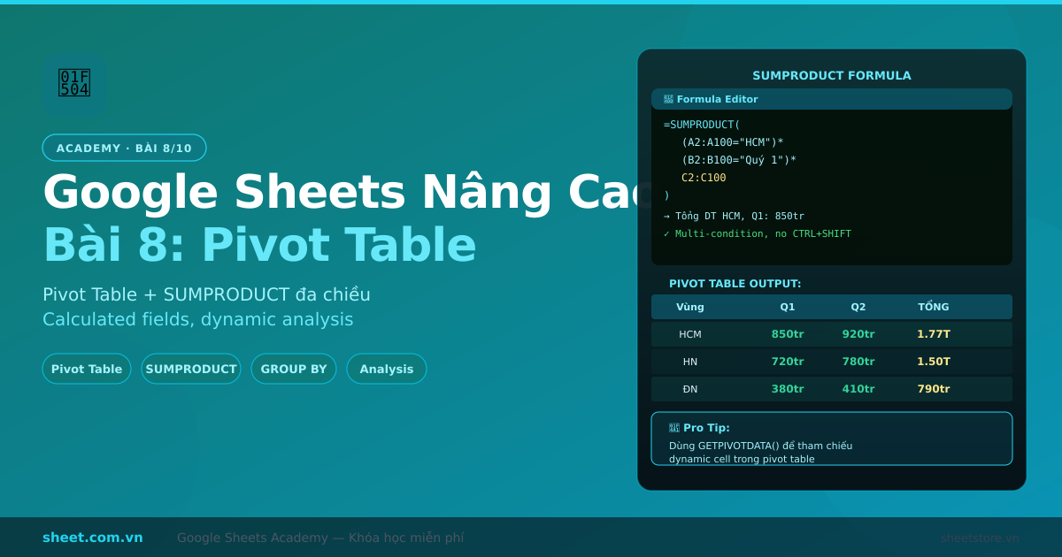 Hướng dẫn Pivot Table và SUMPRODUCT Google Sheets từ cơ bản đến nâng cao. Phân tích dữ liệu đa chiều, calculated fields, multi-criteria aggregation, ứng dụng thực tế.