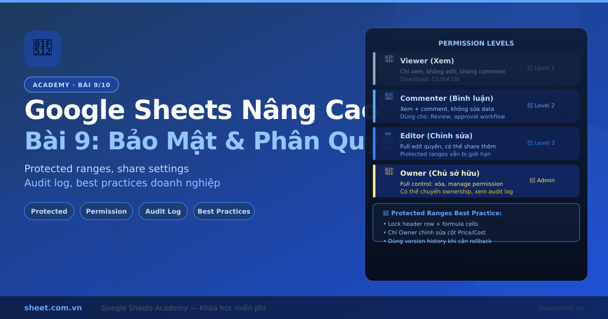 Hướng dẫn bảo mật và phân quyền Google Sheets. Protected ranges, share settings, ẩn công thức, audit log với Apps Script, best practices bảo vệ dữ liệu doanh nghiệp.