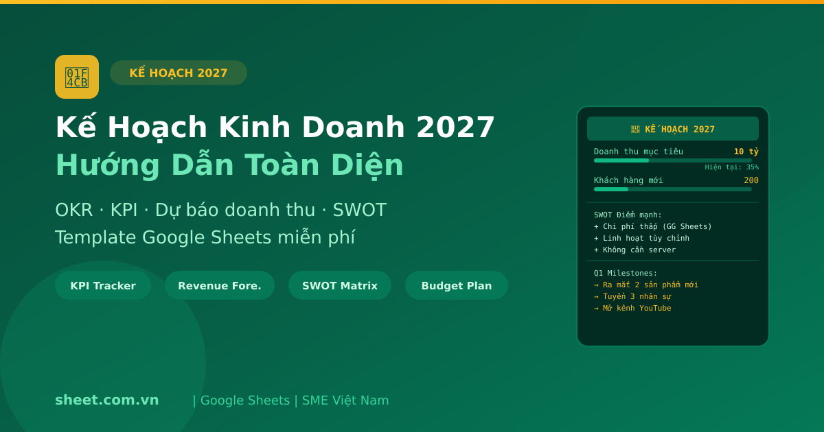 Hướng dẫn lập kế hoạch kinh doanh 2027 toàn diện với Google Sheets. KPI tracker, dự báo doanh thu, phân tích SWOT, ngân sách hoạt động - template miễn phí cho SME.