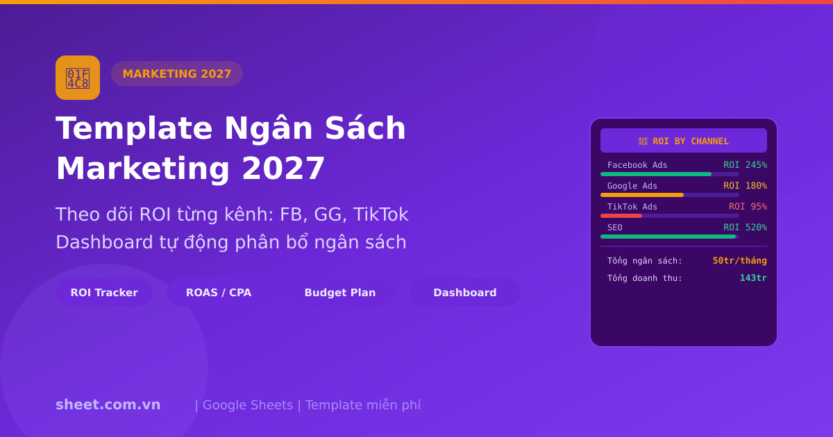 Template Google Sheets miễn phí quản lý ngân sách marketing 2027. Theo dõi ROI từng kênh (Facebook, Google, TikTok), phân bổ ngân sách tối ưu, dashboard tự động cập nhật.