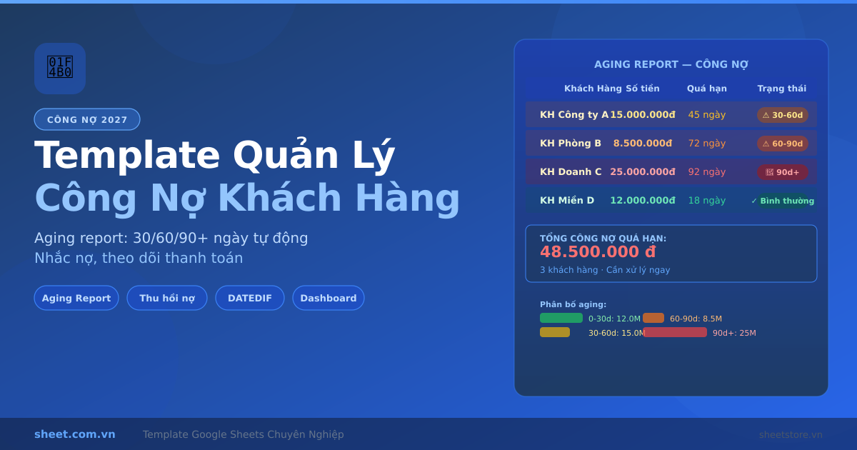 Template Google Sheets quản lý công nợ khách hàng 2027 với aging report tự động, phân loại nợ 30/60/90 ngày, nhắc nợ và lịch sử thanh toán. Giải pháp miễn phí kiểm soát nợ phải thu hiệu quả cho SME.