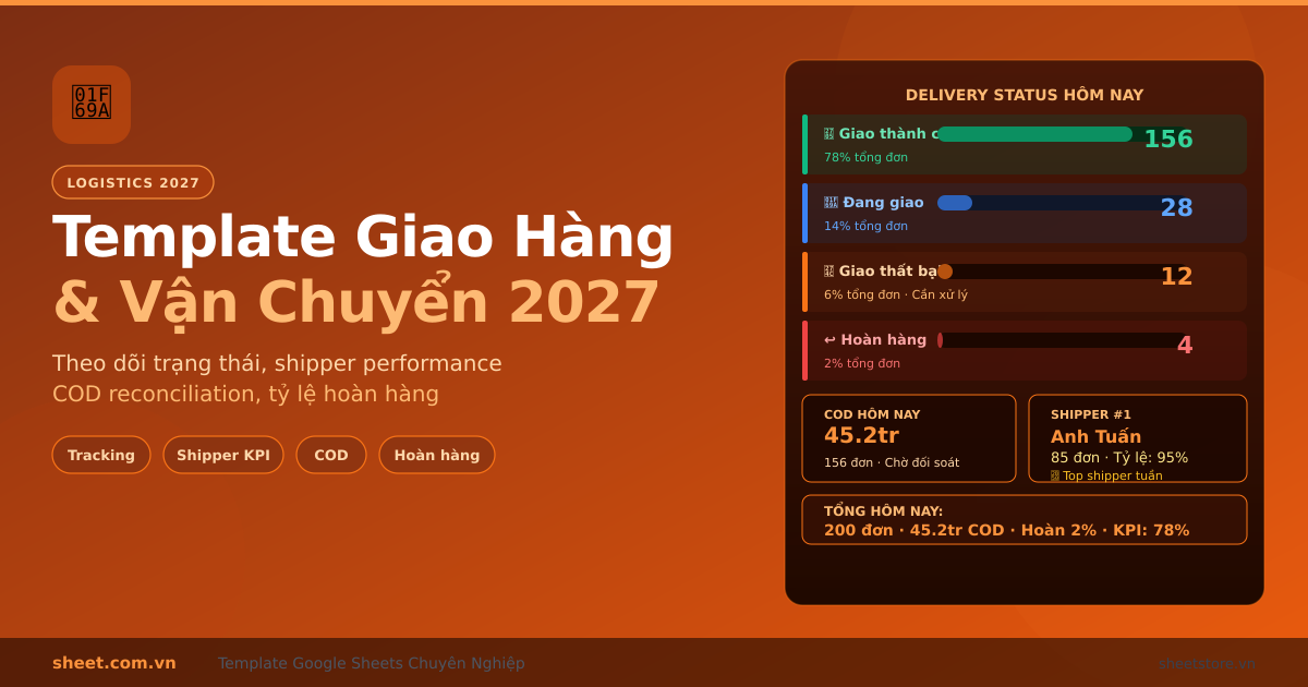 Template Google Sheets quản lý giao hàng vận chuyển 2027. Theo dõi trạng thái đơn hàng, shipper performance, COD reconciliation, chi phí vận chuyển, tỷ lệ hoàn hàng.
