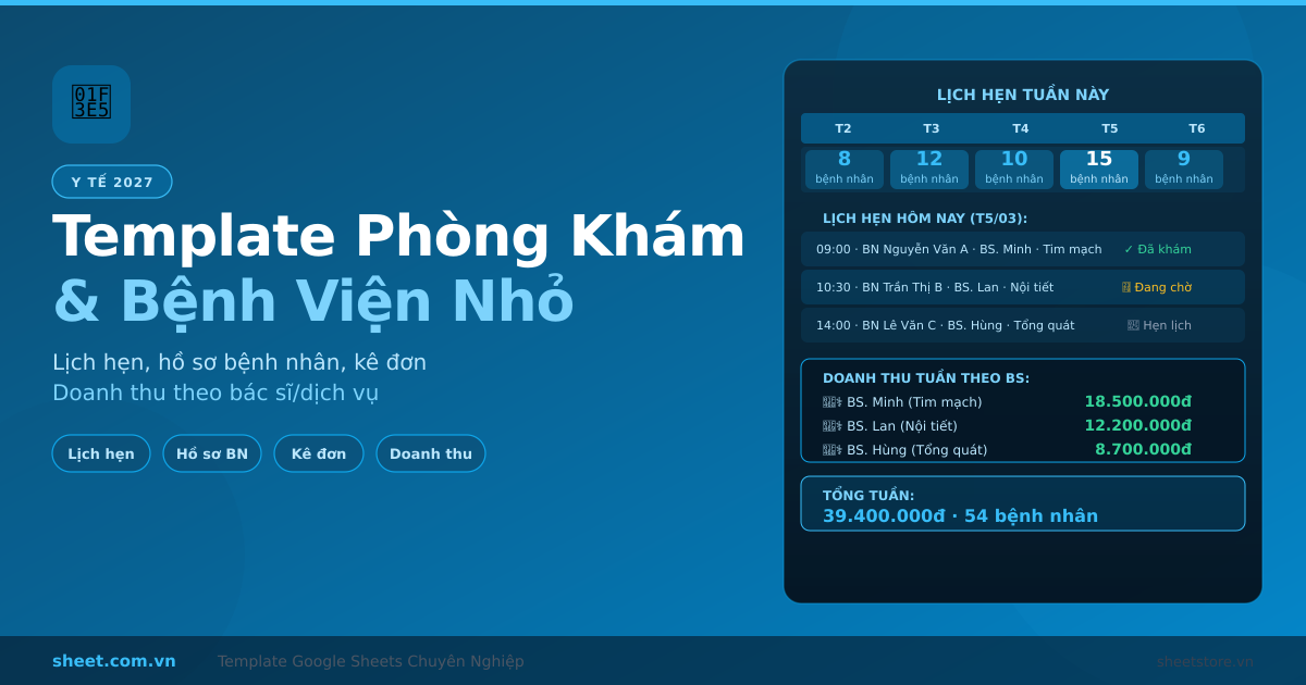 Template Google Sheets quản lý phòng khám bệnh viện nhỏ 2027 miễn phí. Lịch hẹn bệnh nhân, hồ sơ bệnh án, kê đơn thuốc, doanh thu theo bác sĩ/dịch vụ, báo cáo tự động.
