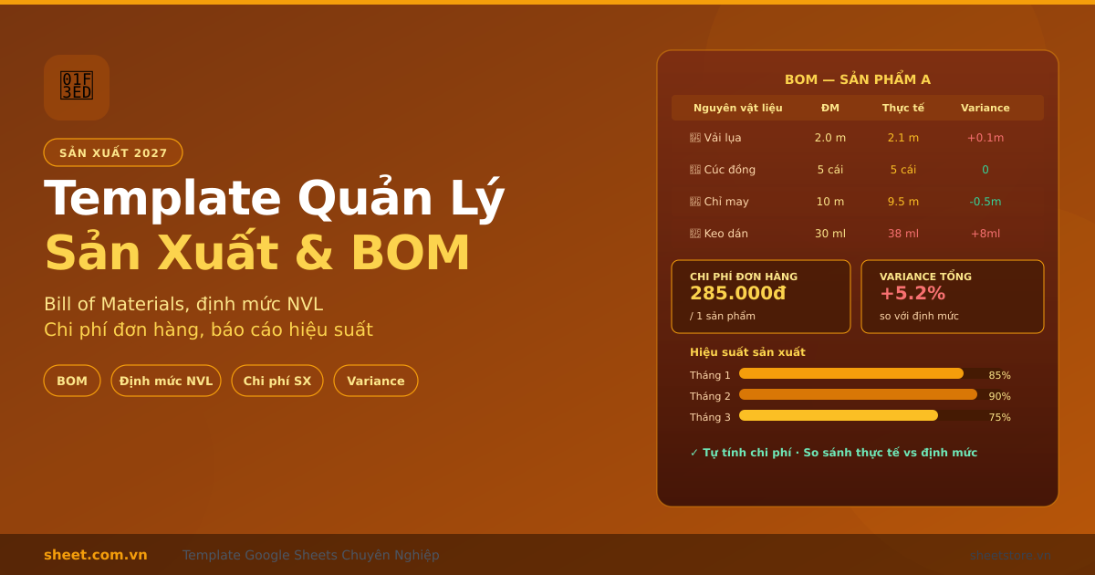 Template Google Sheets quản lý sản xuất và định mức nguyên liệu (BOM) 2027 miễn phí. Kế hoạch sản xuất, theo dõi NVL tiêu hao vs định mức, phân tích variance, chi phí đơn hàng tự động.