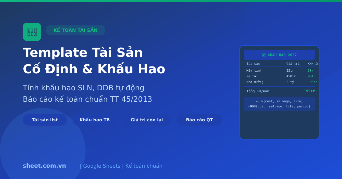 Template Google Sheets tự động tính khấu hao tài sản cố định theo phương pháp đường thẳng (SLN) và số dư giảm dần (DDB). Quản lý danh sách tài sản, giá trị còn lại, báo cáo kế toán chuẩn TT 45/2013.
