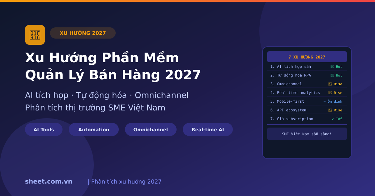 Phân tích chuyên sâu 7 xu hướng phần mềm quản lý bán hàng 2027: AI tích hợp, tự động hóa quy trình, omnichannel thực sự, real-time analytics. Dự báo thị trường và lời khuyên cho SME Việt Nam.