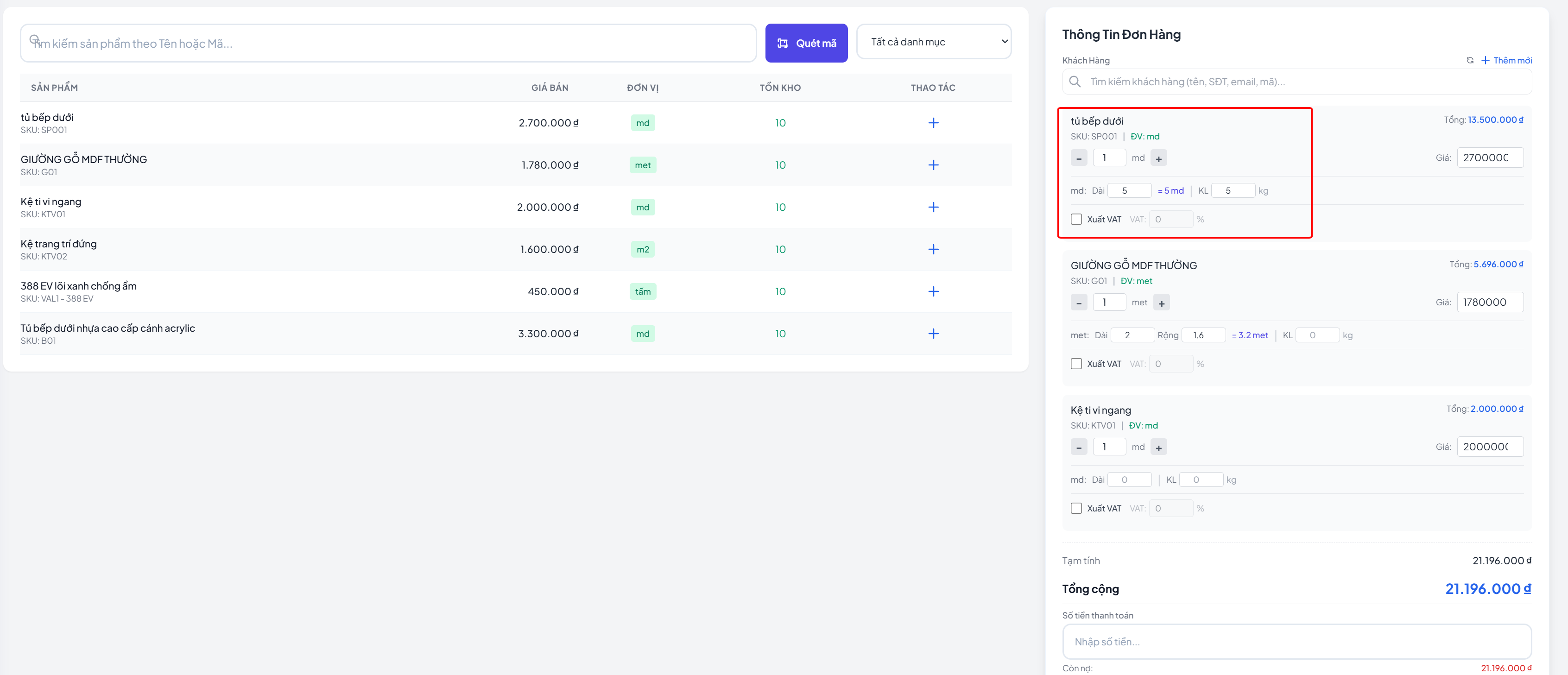 Phần Mềm Quản Lý Bán Hàng Nội Thất — Tính Giá Theo Mét Dài, Mét Vuông & Chấm Công Nhân Viên